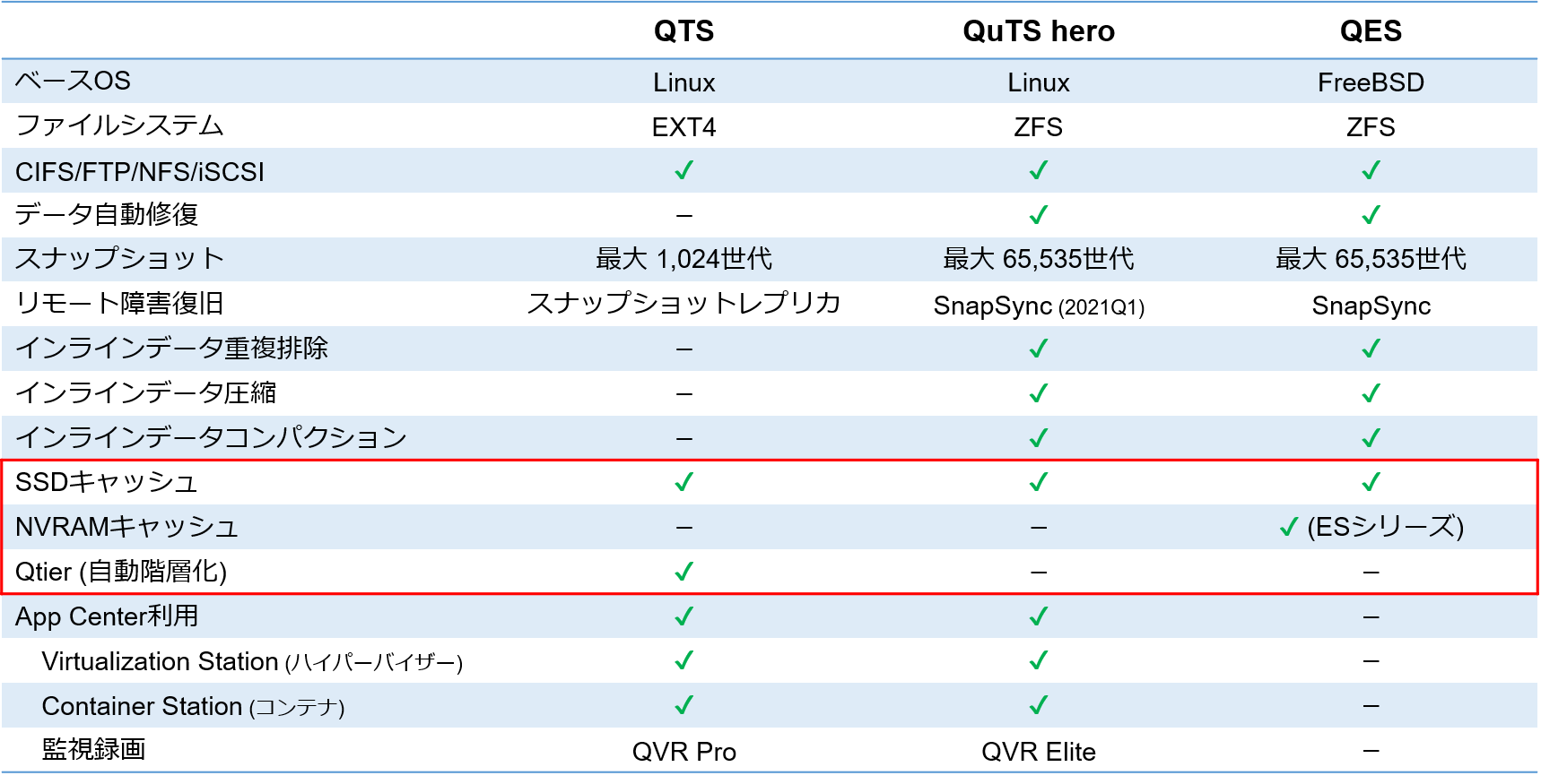 上図対象は、『QTS』、『QuTS hero』、『QES (SSDキャッシュ)』、『QTS (Qtier)』です。