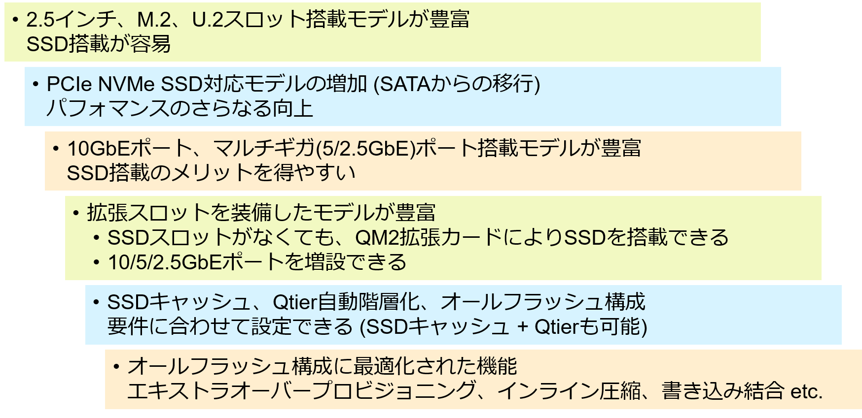 SSDキャッシュアクセラレーション、HDD/SDDハイブリッド構成による自動階層化、オールフラッシュ構成など、NAS高速化のためのSSD活用方法をご紹介します。
