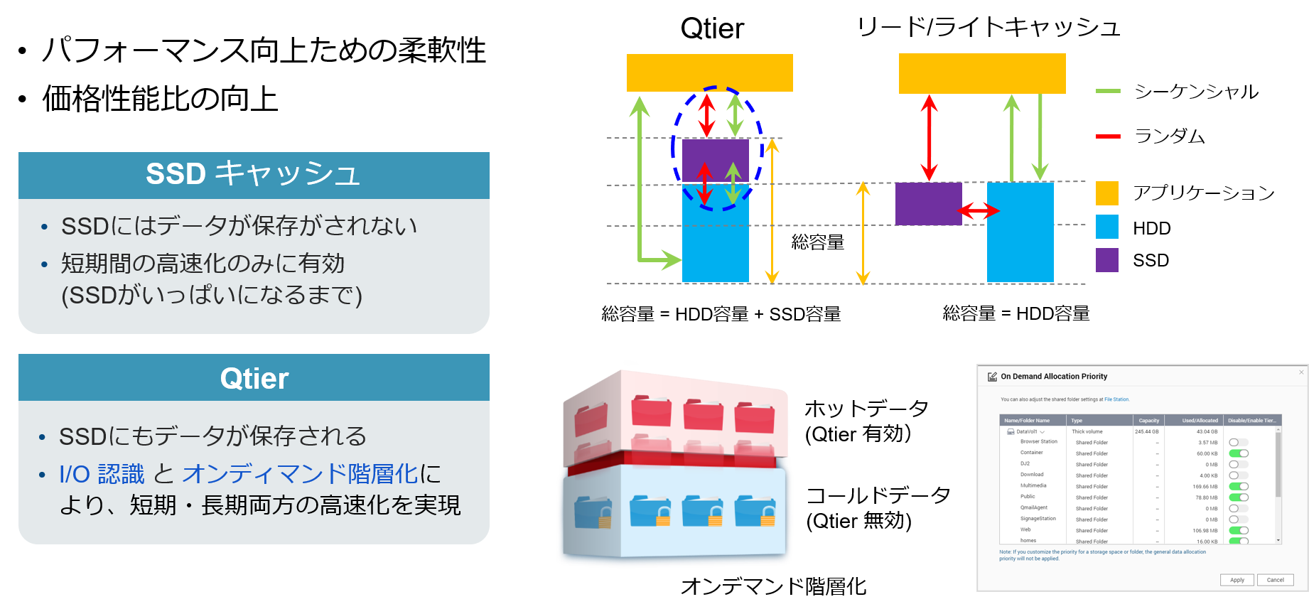 - Qtier – I/O認識 & オンデマンド階層化(QTS, QuTS hero, QES (SSDキャッシュ)QTS (Qtier))