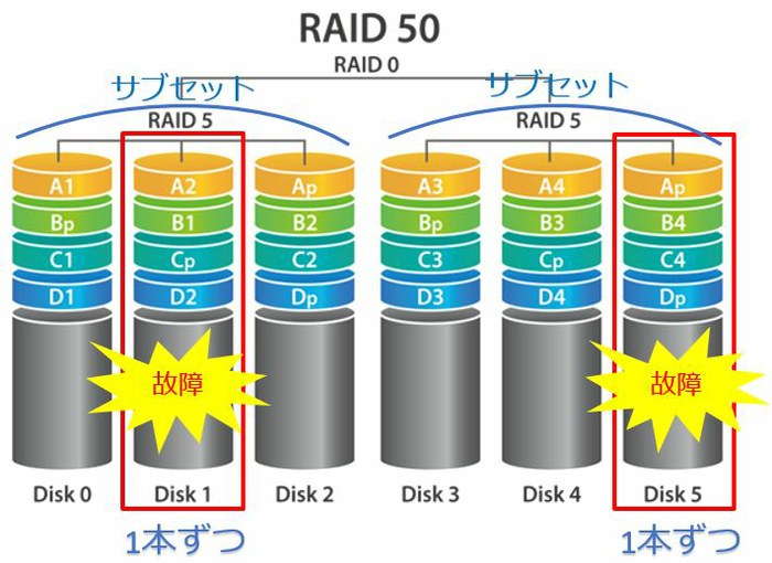 さらにRAID 50では、複数のRAID 5によるサブセットでアレイが構成されているため、サブセット1つにつき1本のディスク故障に耐える冗長性を発揮します。