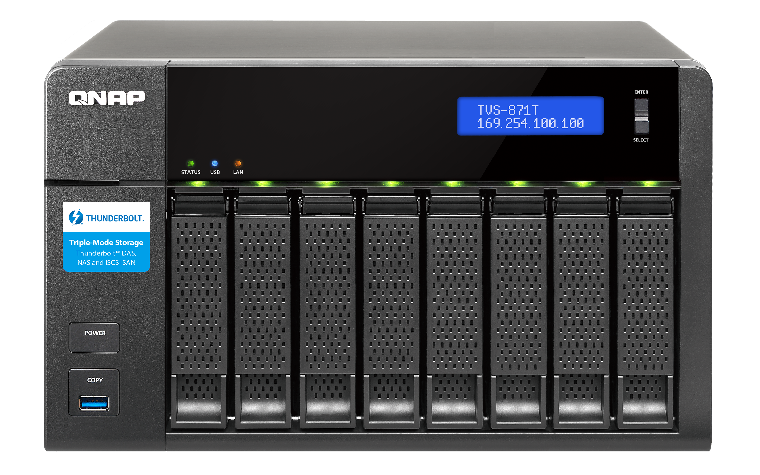 QNAP TVS-871Tは世界初のThunderbolt DAS/NAS/iSCSI SANトリプルソリューションです。Thunderbolt 2の驚異的なパワーで4K動画の転送と再生に対応し、Thunderboltを備えたMacの4Kワークフロー、ファイルストレージ、高速共有に最適です。