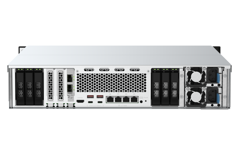 TS-h3088XU-RP は4つの2.5GbE RJ-45ポート (2.5/1GbE対応)を装備、内蔵デュアルポート25GbE SFP28 SmartNIC (25/10/1GbE対応)、NVIDIA Mellanox ConnectX-4 Lx SmartNICコントローラ搭載でRDMA (iSER)用のiSCSI拡張に対応、 NASおよびESXiサーバー間でのデータ転送性能を向上させ、CPU負荷を低減させます。ポートトランキングおよび自動ネゴシエーションを備えた TS-h3088XU-RP は、帯域幅と信頼性を確保、行く千ものエンドポイントユーザーがNASに保存されたデータにスムーズにアクセスでき、データセンター、仮想化、大容量ファイル転送、高速バックアップ/リストア、マルチメディア転送などの負荷の大きなアプリケーションのニーズに応えます。TS-h3088XU-RP は、QNAP製マネージドおよびアンマネージド 2.5GbE/10GbE スイッチと理想的なマッチングで、予算に負担をかけずに高速でセキュア、かつスケーラブルなネットワーク環境を構築します。