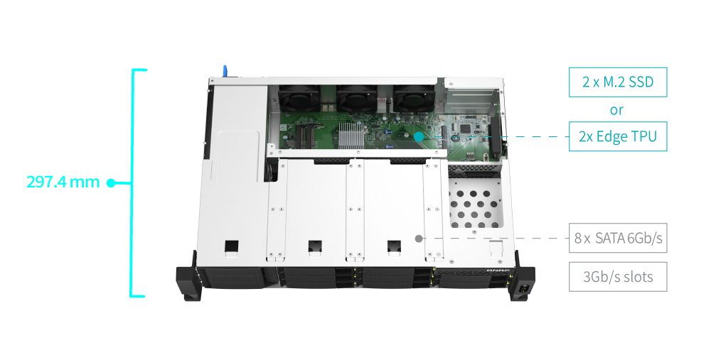 8ベイの TS-873AeU-RPは2つのM.2 PCIe Gen.3 x 1スロットを装備しており、キャッシュアクセラレーションまたはSSDストレージプールによるパフォーマンス向上、またはEdge TPUによるAI画像認識を実現します。