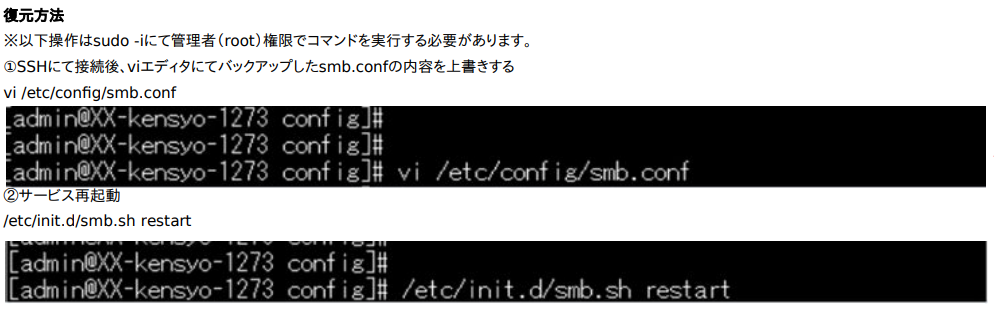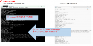 ・SSHにて接続後、viエディタにてバックアップしたsmb.confの内容を上書きする