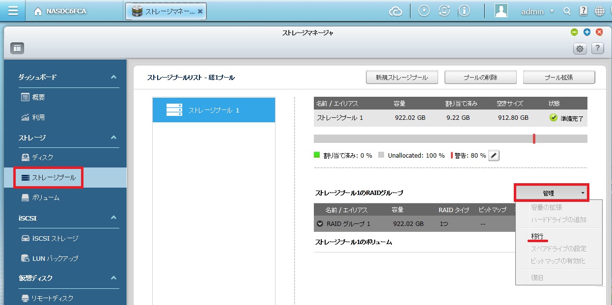 - NASのWebUIにログインし、ストレージマネージャからストレージプールを開く