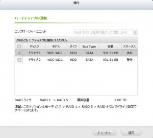 - RAIDグループに含めたいディスクを選択して適用ボタンを押す