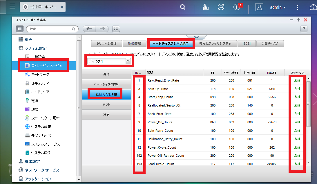 ストレージマネージャ>ハードディスクS.M.A.R.T.>S.M.A.R.T.情報>該当のディスクをプルダウンで選択