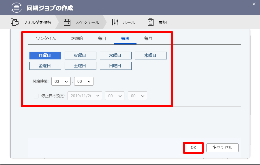 7.スケジュールの設定では、リアルタイム同期やスケジューラーを設定します。