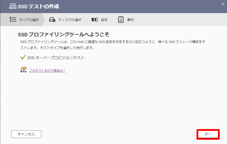 5.テスト対象のSSDにチェックを入れて「次へ」をクリックします。