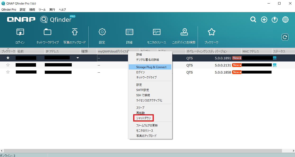 Qfinder Proを起動しシャトダウンしたいNASを選択して右クリックする