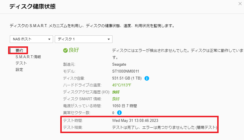 なお、テストの結果は、ディスク健康状態>要約 へ表示されます。